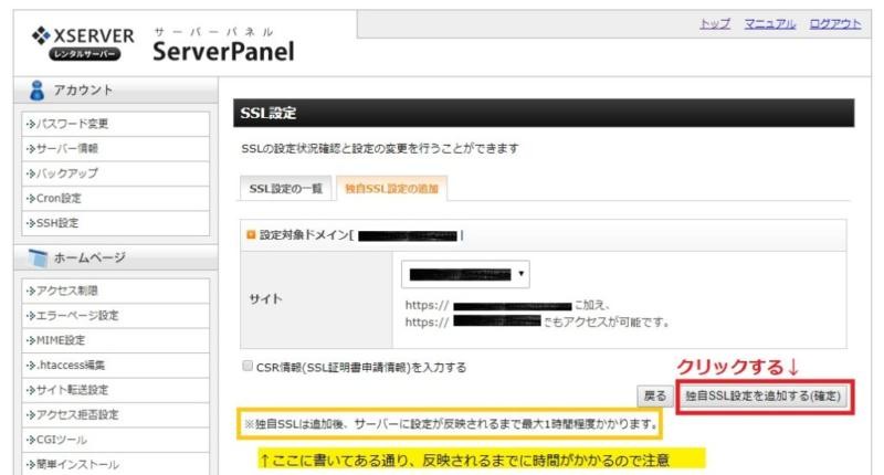 - 「独自SSL設定を追加する(確定)」をクリックする