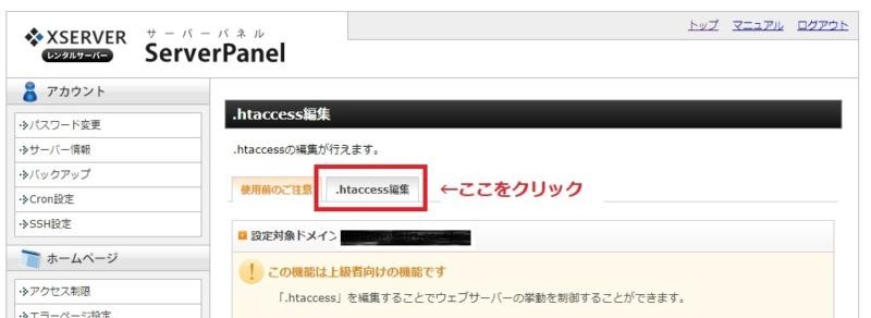 - 「.htaccess編集」タブをクリックします