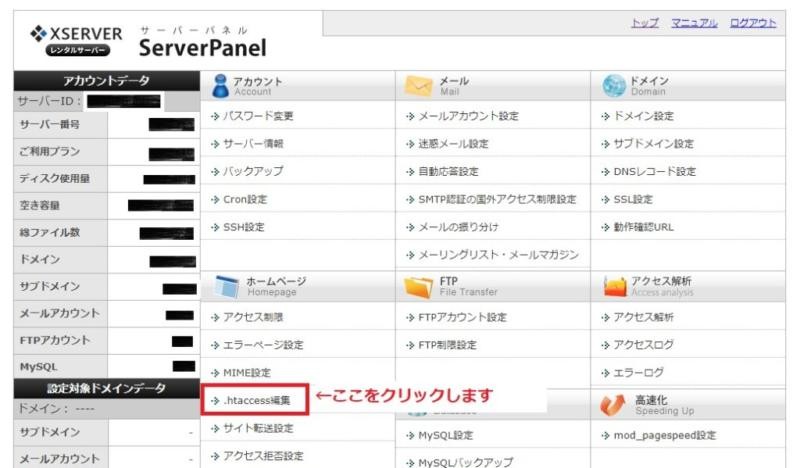- 「.htaccess編集」をクリックします